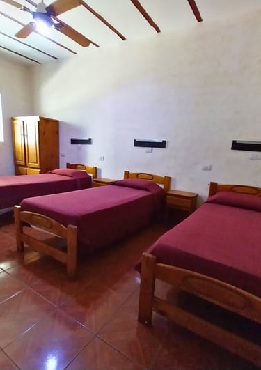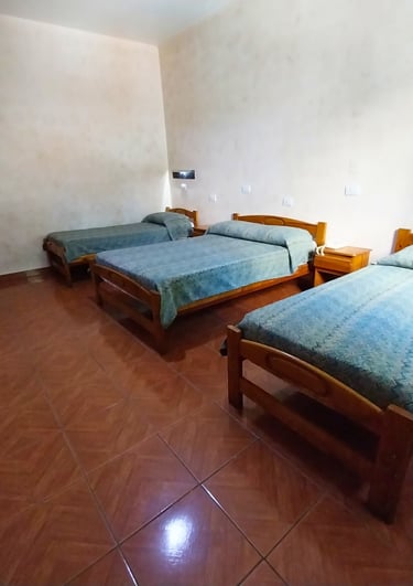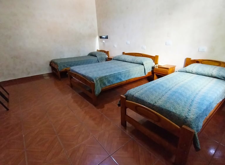 Habitación Cuádruple con todos los servicios: escritorio de trabajo, WiFi, TV por cable y baño privado.