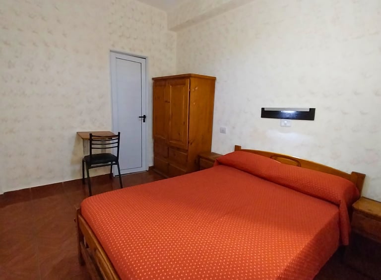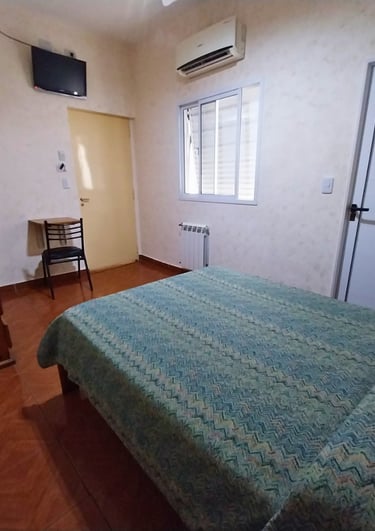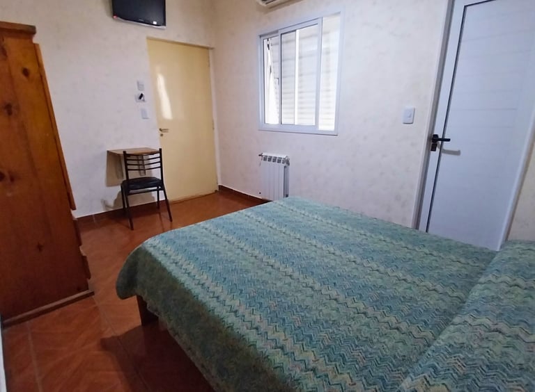 Habitación doble con todos los servicios: escritorio de trabajo, WiFi, TV por cable y baño privado.