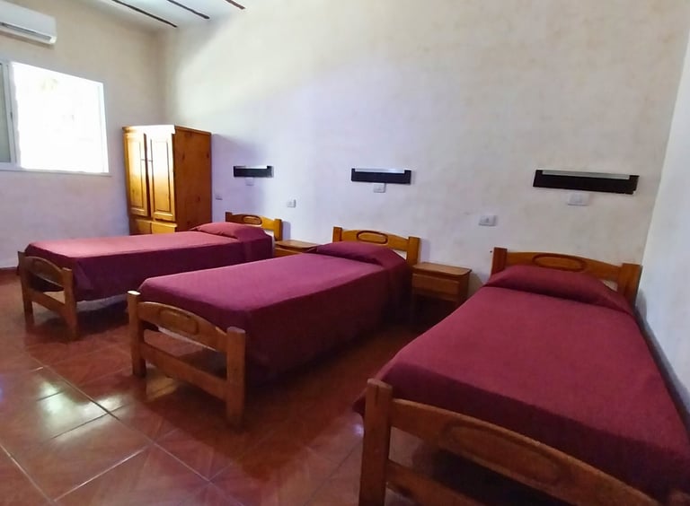 Habitación Triple con todos los servicios: escritorio de trabajo, WiFi, TV por cable y baño privado.